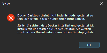 Nach dem Klick auf „OK“ öffnet sich automatisch die offizielle Docker-Download-Website. Bitte laden Sie hier Docker Desktop für Windows herunter und installieren Sie es auf Ihrem Computer.