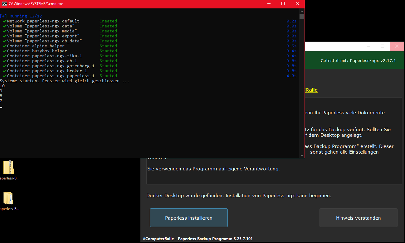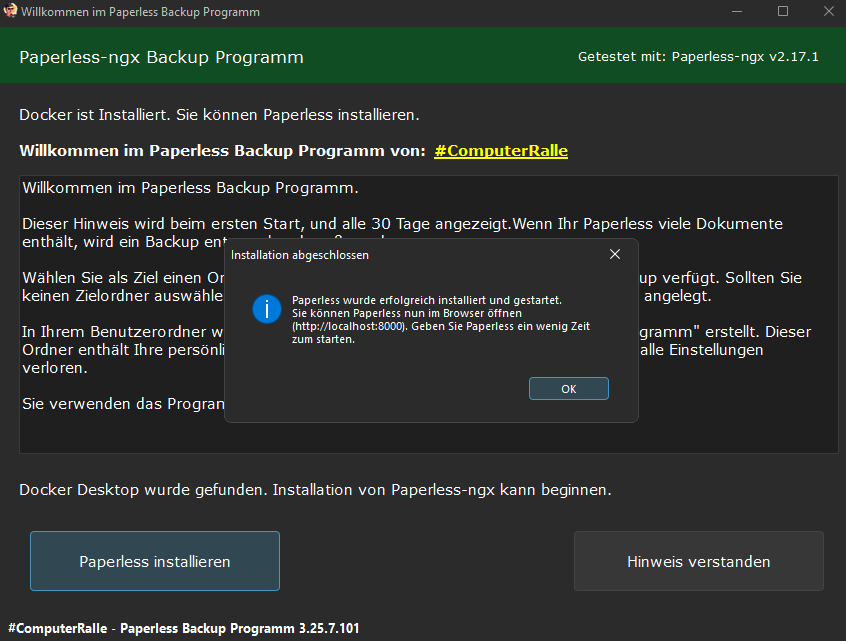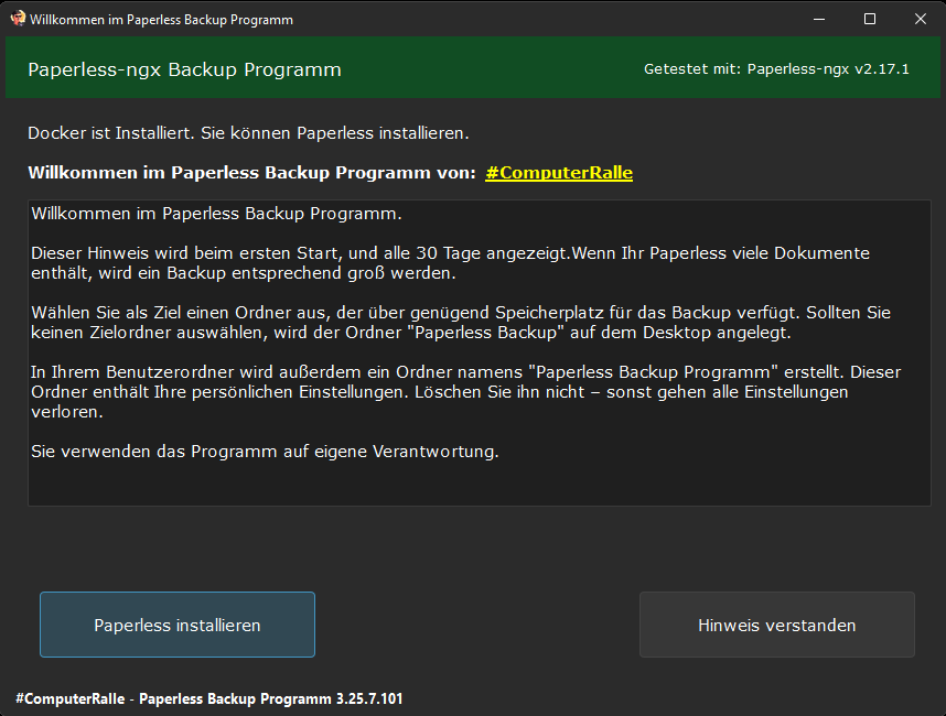 Das Paperless Backup Programm erkennt automatisch, ob Docker bereits vorhanden ist. Ist das nicht der Fall, wird die Installation vorbereitet und alle erforderlichen Komponenten schrittweise eingerichtet. Auch die docker-compose.yml wird automatisch erstellt, ebenso wie der Paperless-Container selbst.