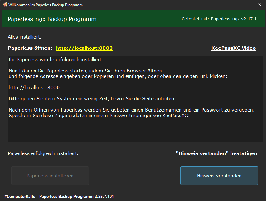 Ihre Paperless-Dokumente würden zwar erhalten bleiben, aber alle wichtigen Einstellungen, Zeitpläne und Skripte wären verloren. Im Fall einer Löschung müssten Sie die Einrichtung einfach erneut durchlaufen. Es geht nichts kaputt – aber es bedeutet unnötigen Aufwand. Ich habe mir große Mühe gegeben, das Programm so einfach und verständlich wie möglich zu gestalten, damit wirklich jeder damit zurechtkommt – auch ohne technisches Vorwissen.