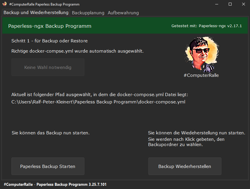 Dort wird auch die aktuelle docker-compose.yml für Ihre Paperless-Installation gespeichert, damit bei einem späteren Wiederherstellen oder Umzug alle Einstellungen erhalten bleiben.